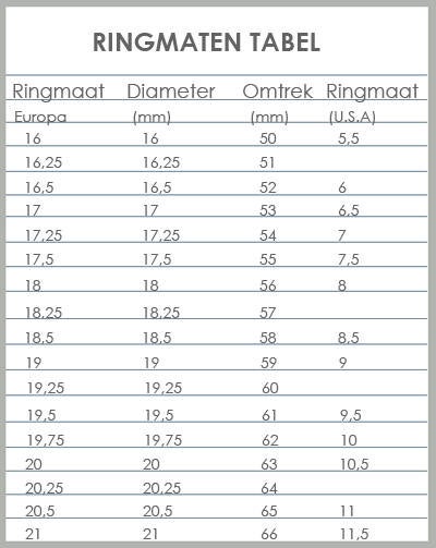 De maten die staan aangegeven zijn ringmaten. Zie hieronder een tabel waar je kunt aflezen welke maat voor jou geschikt is.